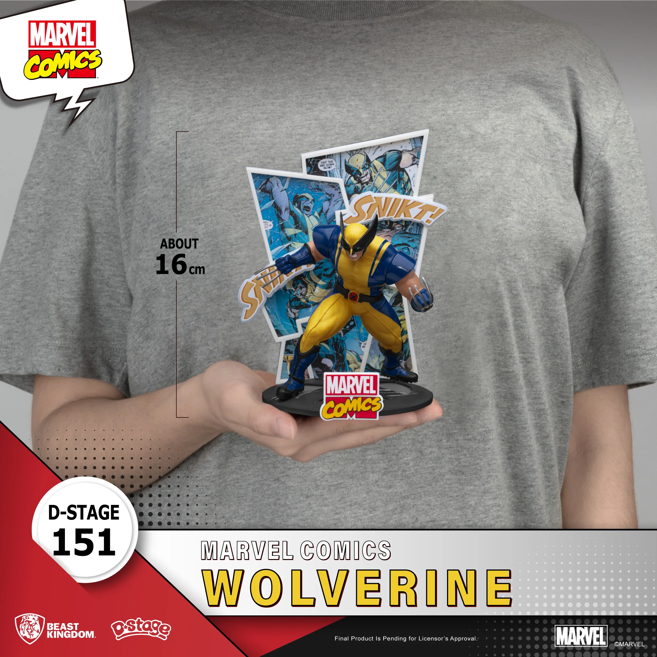 D-Stage řada přináší Wolverina ve slavném modro-žlutém kostýmu v bojovém postoji. figurka má komiksové pozadí a podstavec s logem Marvel.